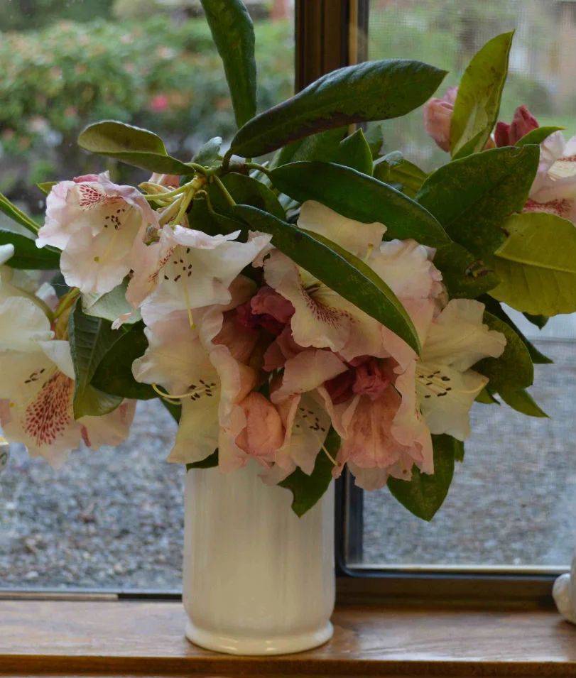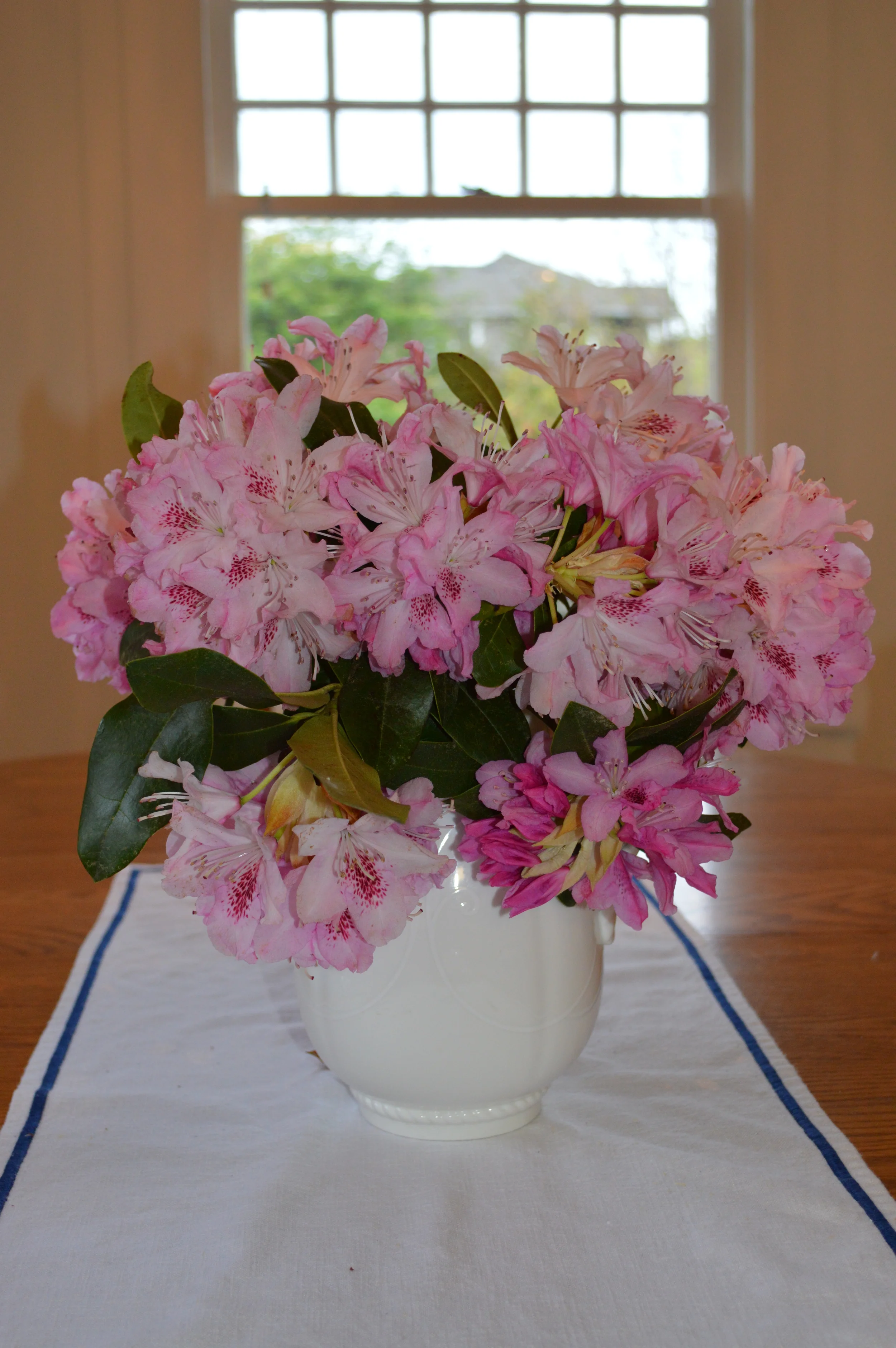 /One of the things I love about spring is the abundance of flowers for sale at affordable prices. Flowers, like coffee, are one of my small obsessions. Who can resist a bouquet of daffodils for 99 cents a bunch, or bouquet of tulips for 3 dollars a bunch? Or, if I'm feeling like there simply isn't much room in the budget for flowers, I grab the clippers and walk outside to cut some fresh rhododendron blossoms....so lovely...and free!
